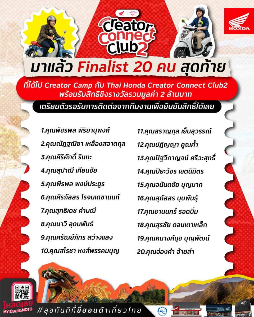 รายชื่อผู้เข้ารอบสุดท้าย Thai Honda Creator Connect Club 2 : สุขทันทีที่ขี่ฮอนด้าเที่ยวไทยจำนวน 20 ท่าน