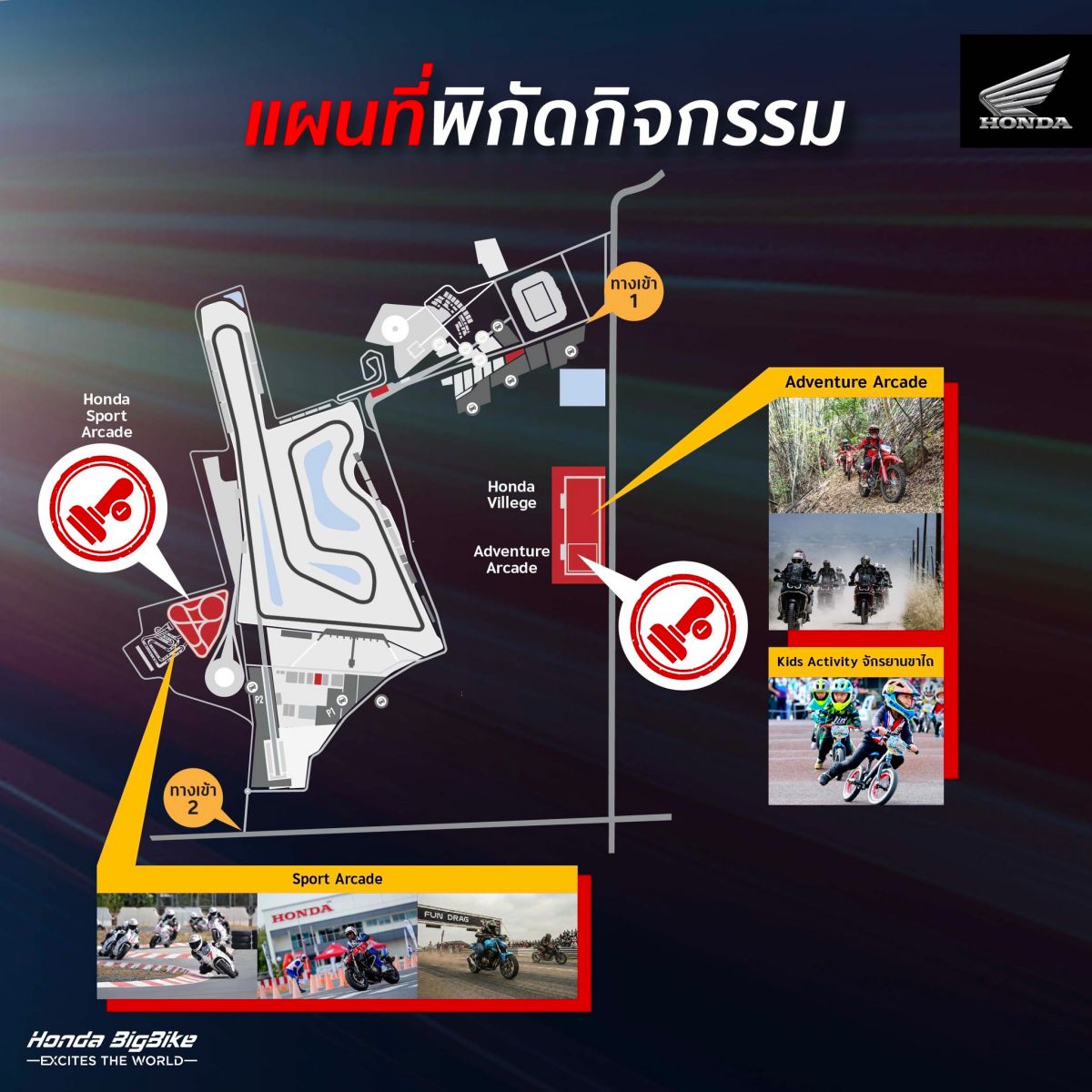 Honda Moto Mania 2026 จัดเต็มกิจกรรมไฮไลต์ถึง 5 รูปแบบ แบ่งเป็น 2 โซนหลัก ได้แก่ Sport Arcade และ Adventure Arcade ครอบคลุมทั้งการแข่งขันทางเรียบ สนามเทคนิค และกิจกรรมสายแอดเวนเจอร์