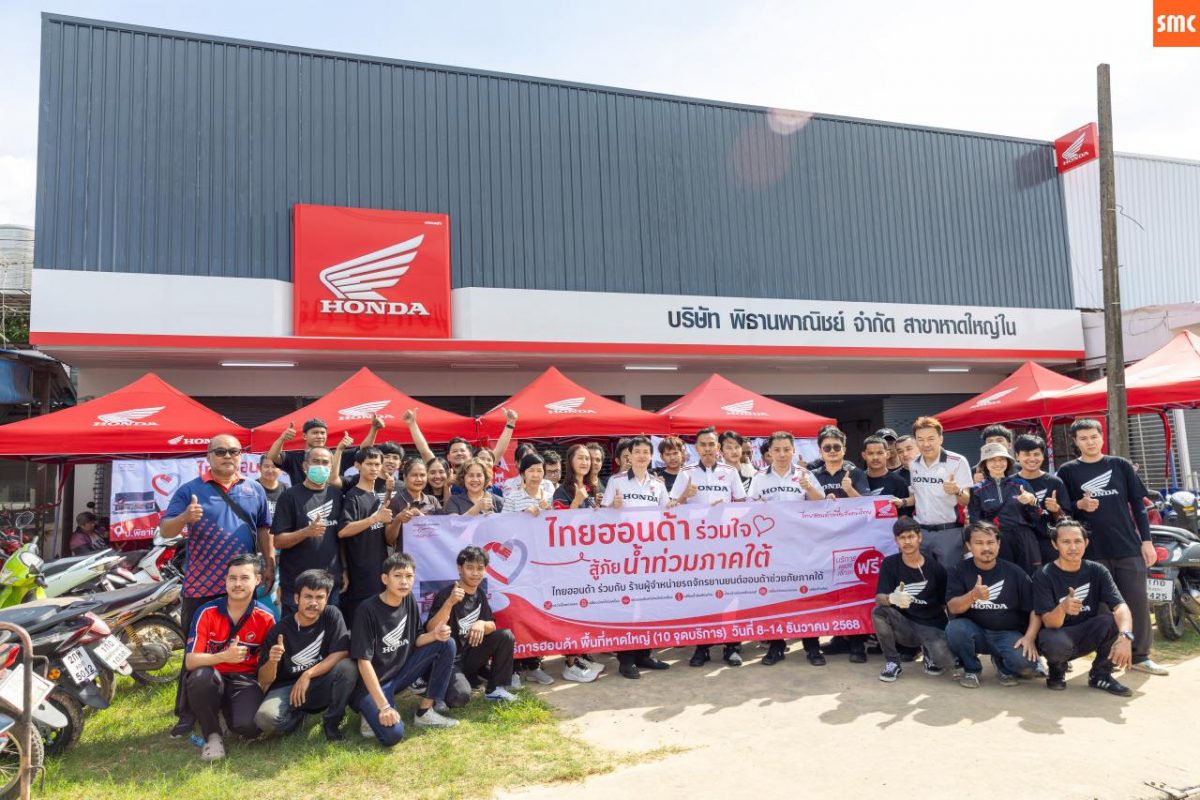 ไทยฮอนด้า ร่วมกับร้านผู้จำหน่ายรถจักรยานยนต์ฮอนด้าทั่วประเทศ เดินหน้าช่วยเหลือผู้ประสบภัยภาคใต้ภายใต้โครงการ “ไทยฮอนด้า ร่วมใจสู้ภัยน้ำท่วมภาคใต้” โดยส่งทีมช่างมืออาชีพ และอาสาสมัครช่างศูนย์บริการฮอนด้าจากทั่วประเทศกว่า 200 คน พร้อมอุปกรณ์ช่างครบชุด บินตรงลงพื้นที่หาดใหญ่เพื่อให้บริการตรวจเช็กและซ่อมรถที่ได้รับผลกระทบจากน้ำท่วมอย่างเร่งด่วน หลังมีประชาชนนำรถเข้ารับบริการมากกว่า 1,000 คัน ภายในวันแรก