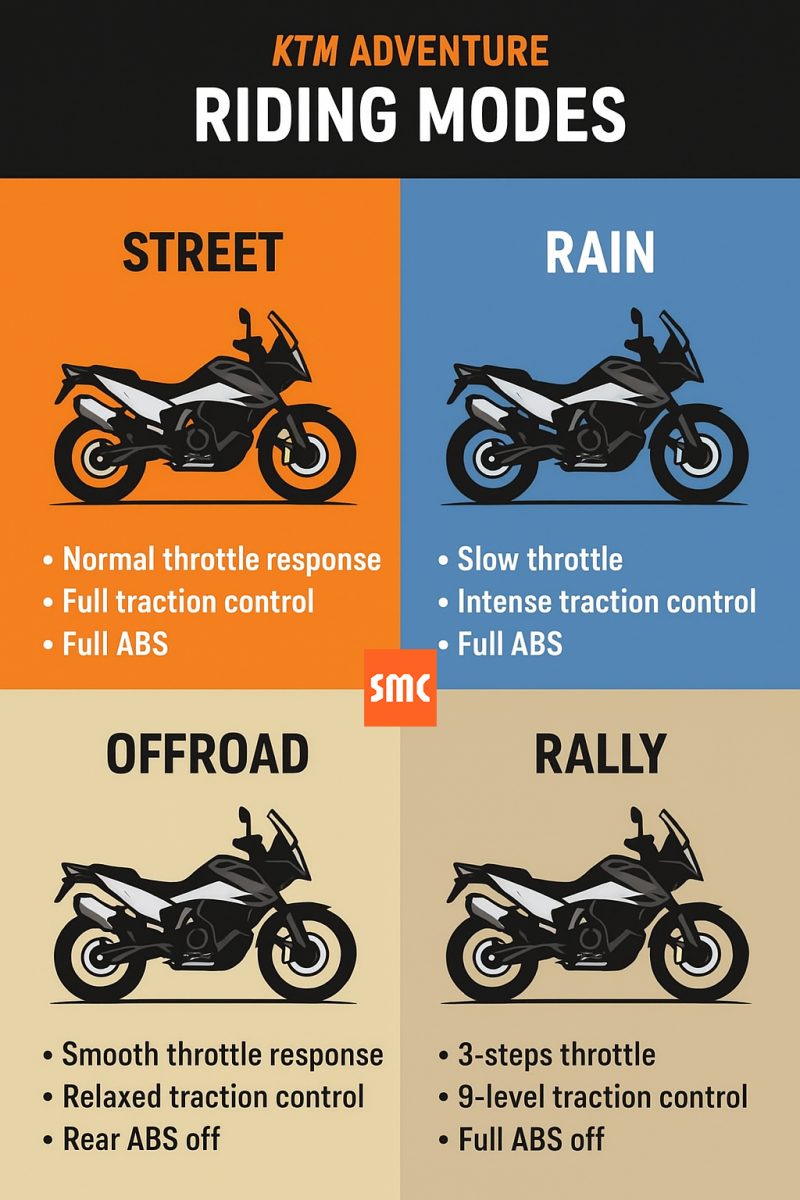 รถแอดเวนเจอร์จากค่ายส้ม “KTM 790 Adventure” มาพร้อมระบบ Ride Modes ที่สามารถปรับได้ถึง 4 โหมดหลัก ได้แก่ Street, Rain, Offroad และ Rally ซึ่งแต่ละโหมดจะเปลี่ยนพฤติกรรมของเครื่องยนต์ ระบบช่วยควบคุม และระบบเบรกให้เหมาะกับสภาพถนนที่แตกต่างกัน โดยทั้งหมดนี้ควบคุมผ่าน ECU ของรถ